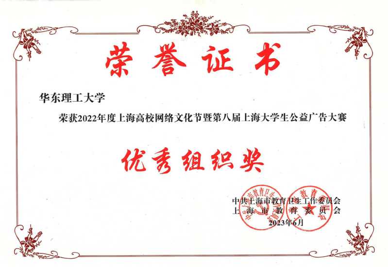 日前,市教卫工作党委、市教委联合举办的“争做校园好网民,凝聚网络正能量,青春献礼二十大”上海高校网络文化节暨第八届上海大学生公益广告大赛(以下简称“一节一推”)正式公布获奖结果,我校喜获丰收,共有16件师生作品分获一等奖4项、二等奖4项、三等奖8项,我校同时获得“优秀组织奖”的荣誉。