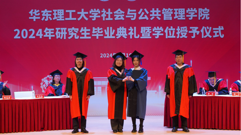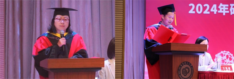 郁惠蕾宣读博士毕业生名单,杨发祥宣读硕士毕业生名单。在激昂的乐声中,毕业生们走上台,依次接过毕业证书、学位证书,并由导师亲自拨穗正冠,为研究生求学生涯画上完美的句点。