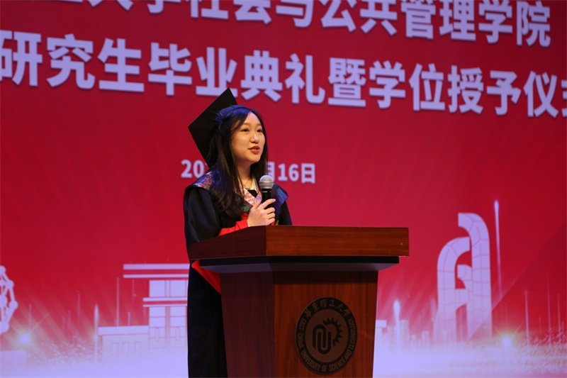 研2021级社会保障庄晨作为学术型硕士毕业生代表,详数并感恩母校、学院给予她的成长,将学院赠予她的珍贵礼物归纳为以下三点:追求科学真知的坚毅、小我融入大我的奉献和为理想永不止步的奋斗。在即将分别之际,她衷心祝愿大家皆能心怀感恩,越过山重水复,迎来柳暗花明。