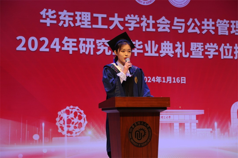 研2021级社会工作胡玉婷作为专业型硕士毕业生代表,回顾三载求学生涯,是感动亦是成长。从一个农家女孩成长为一名硕士毕业生,她感受到许多中华民族守望相助的深厚情感。在华理求学的岁月,她也将自己的青春与热血,尽情挥洒在祖国需要的地方,“三载木棉情,一生华理人”是她对母校最深沉的爱的表达。
