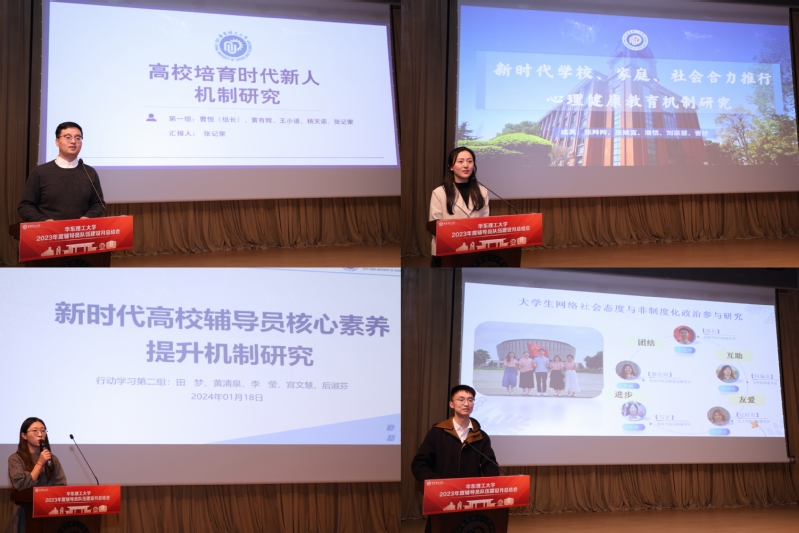 “赋能提效”辅导员成长计划重点活动——“行动学习”骨干辅导员研修营的四个小组代表在大会上依次进行汇报,聚焦时代新人培育、辅导员核心素养提升、校家社合力推行心理健康教育、大学生网络社会态度等选题展示了问题分析、调研情况、实践落实、建议对策和未来计划等方面的研修成果。