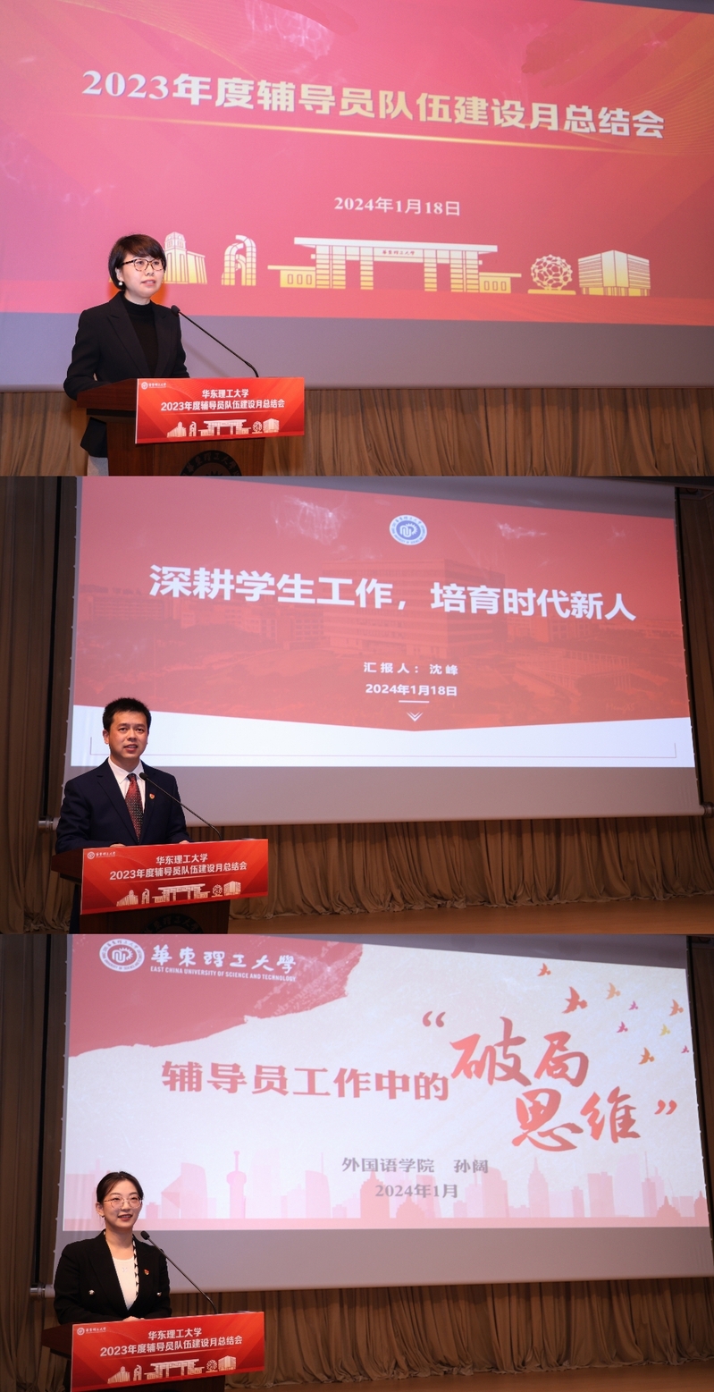 在交流汇报环节,2020上海高校辅导员年度人物、商学院辅导员沈峰以“深耕学生工作,培育时代新人”为题,主要展示了参与牛津大学学生工作教师发展项目访学体会,从创新教学方法、丰富教育内容、强化社会实践、营造创新文化氛围等方面推进学生工作高质量发展进行了交流。2023年上海高校辅导员素质能力大赛三等奖获得者、校优秀思想政治教育工作者、外语学院辅导员孙阔以“辅导员工作中的‘破局思维’”为题,从清醒认识、能力提升、把握规律、助力成长等方面交流了对于思政工作的理解和创新育人方式方法的思考。