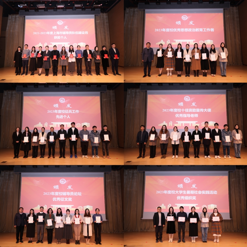 大会集中表彰了在学生工作各个条线取得优异成绩的辅导员,为上海市辅导员队伍建设月相关获奖个人、校优秀思想政治教育工作者、校毕业生就业工作先进集体和先进个人、校大学生暑期社会实践活动优秀组织、校心理健康教育优秀组织和优秀个人、校十佳资助宣传大使优秀指导老师、校学风建设工作先进集体和先进个人、校征兵工作先进个人、校辅导员论坛优秀征文作者等颁发了荣誉证书。