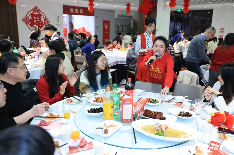 校长献“菜”也献歌。同在3日晚,上海理工大学的年夜饭现场,学校后勤处餐饮中心也精心准备了“展翅高飞(可乐鸡翅)”“牛气冲天(盐水牛肉)”“招财进宝(元宝虾)”等寓意美好、色香味俱全的定制菜谱。席间,校长丁晓东还为师生献唱一首《北京颂歌》,将现场气氛推至高潮。