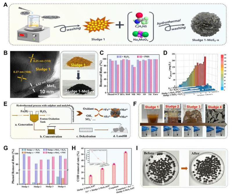 为了实现芬顿反应产生的污泥(铁泥)中铁离子的资源化利用,邢明阳教授团队采用简单的一步水热法将铁泥与MoS₂进行化学复合,利用MoS₂的助催化效应使得铁泥中的铁氧化物(≡Fe3+)重新具有芬顿反应的活性,实现了铁泥的绿色资源化利用。MoS₂表面暴露的≡Mo4+还原活性中心促进了铁泥表面铁离子的循环,提高了表面≡Fe2+的浓度;而MoS₂边缘暴露的低配位S具有捕获质子的特性,可在复合催化剂表面构建酸性微环境,促进表面铁离子向“剪切面”的扩散,提高了固液界面处Fe2+的浓度,从而使得失活后的铁泥重新具有活化H₂O₂或过一硫酸氢盐等氧化剂的能力。实验证实,无论是实验室模拟的铁泥还是化工厂处理废水实际产生的铁泥,在经过MoS₂改性后都可实现对酚类、抗生素类以及染料类等有机污染物高效的降解活性。此外,与公认的零价铁芬顿催化剂相比,资源化后的Sludge-MoS₂催化剂具有更加稳定且长效地降解有机污染物的性能,可实现对苯酚14天以上的长效降解。