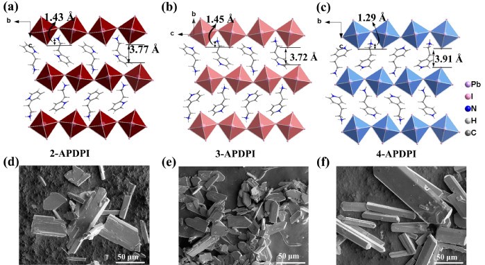 2-APDPI(a)、3-APDPI(b)和4-APDPI(c)沿a轴观察到的结构堆积图,展示出独特的二维DJ型钙钛矿结构。2-APDPI(d)、3-APDPI(e)和4-APDPI(f)的扫描电镜图像。