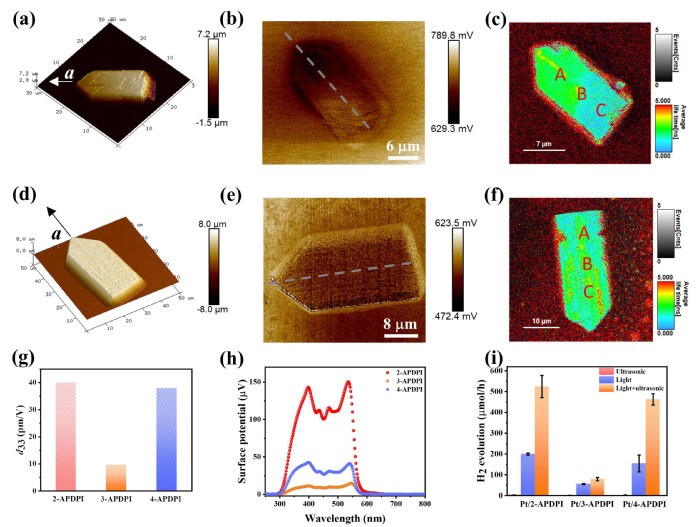 极性2-APDPI单晶的AFM高度分布图(a)、相应的暗态KPFM电势分布图(b)和荧光寿命分布图(c)。中心对称3-APDPI单晶的AFM高度分布图(d)、相应的暗态KPFM电势分布图(e)和荧光寿命分布图(f)。测试得到的2-APDPI、3-APDPI和4-APDPI的d33压电系数(g)和表面光电压(h)。在纯超声、纯光照和光照超声条件下,2-APDPI/Pt、3-APDPI/Pt和4-APDPI/Pt的光催化产氢速率对比(i)。