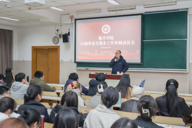 为进一步推进2024届毕业生就业工作,充分调动毕业生就业积极性,提高毕业生就业质量,数学学院于3月8日下午在徐汇校区召开2024届毕业生就业工作冲刺动员会,校学生就业指导服务中心主任郑东应邀参加,为同学们分析就业形势、提供就业指导。数学学院党委书记鲍亮、毕业班辅导员、班导师代表及全体毕业生参加会议,会议由学院党委副书记王帅主持。