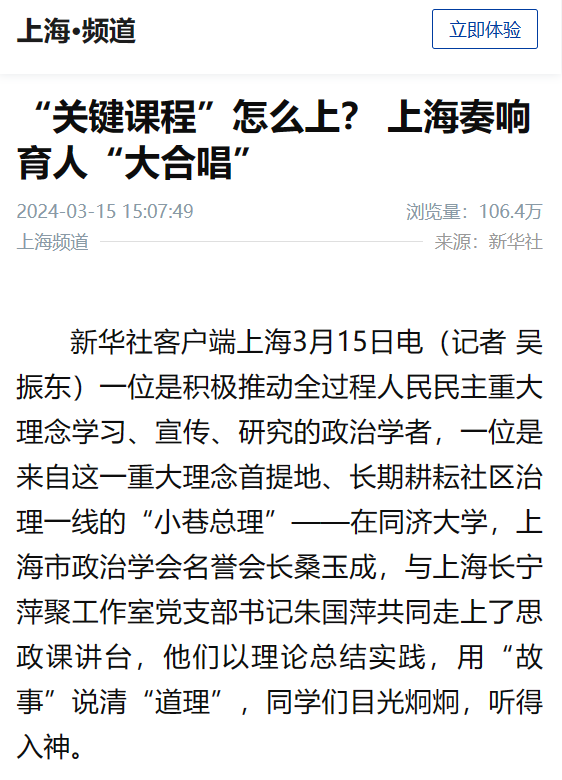 一位是积极推动全过程人民民主重大理念学习、宣传、研究的知名政治学学者,一位是来自全过程人民民主理念首提地、长期耕耘在社区基层治理一线的“小巷总理”——复旦大学教授桑玉成、长宁区萍聚工作室党支部书记朱国萍同时出现在了同济大学的思政课堂上。这是同济大学全面推进大思政课建设的创新探索。