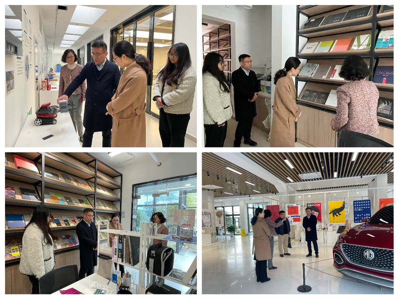 一行人参观了艺术学院设计工作室。王珊对工作室的育人理念、运营机制、组织架构及文创特色等作了详细介绍。一行人还参访了徐汇校区逸夫楼报告厅和演讲厅。