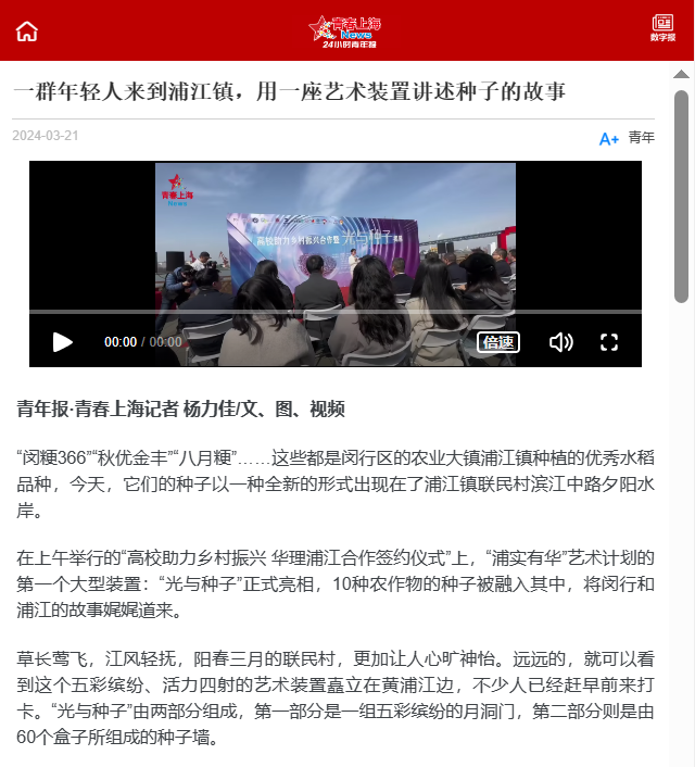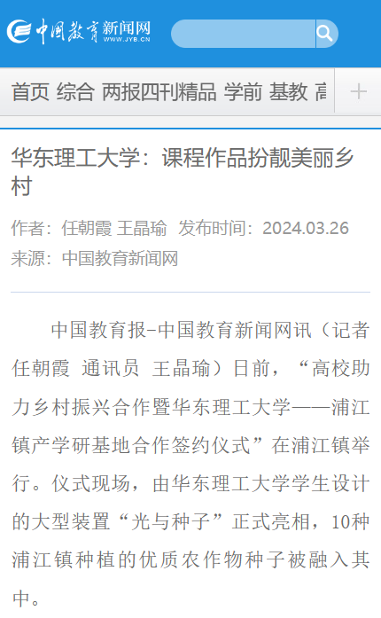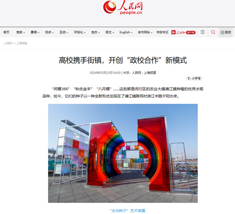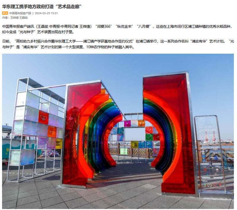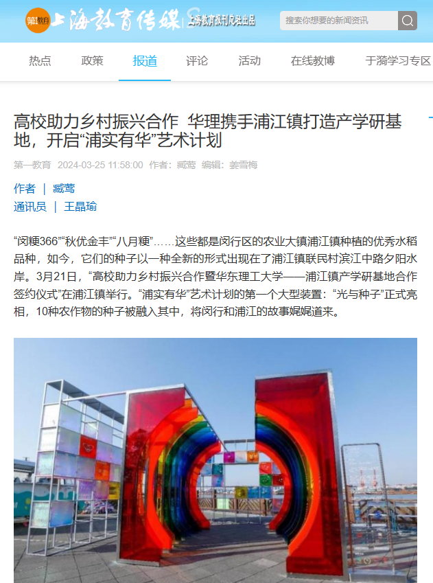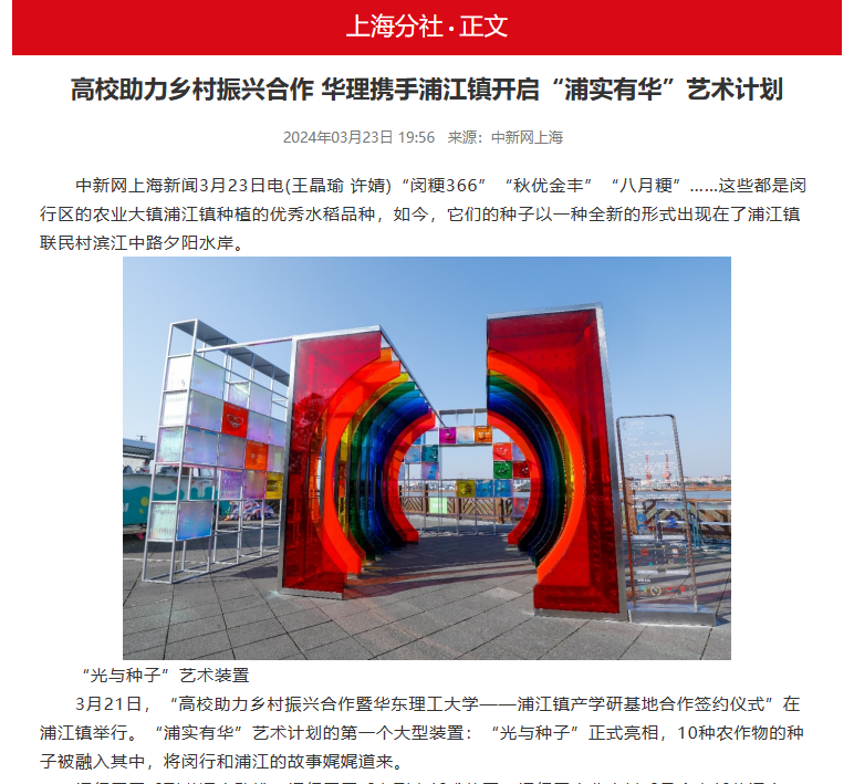 3月21日,“高校助力乡村振兴合作暨华东理工大学—浦江镇产学研基地合作签约仪式”在浦江镇举行。“浦实有华”艺术计划的第一个大型装置——“光与种子”正式亮相。该计划由艺术学林轶南团队策划,旨在通过景观和公共艺术提升浦江镇的风貌,推介当地文化和农业品牌。人民网、中国青年报客户端、中国教育新闻网、中国新闻网、新民网、青春上海、第一教育等媒体进行了相关报道。
