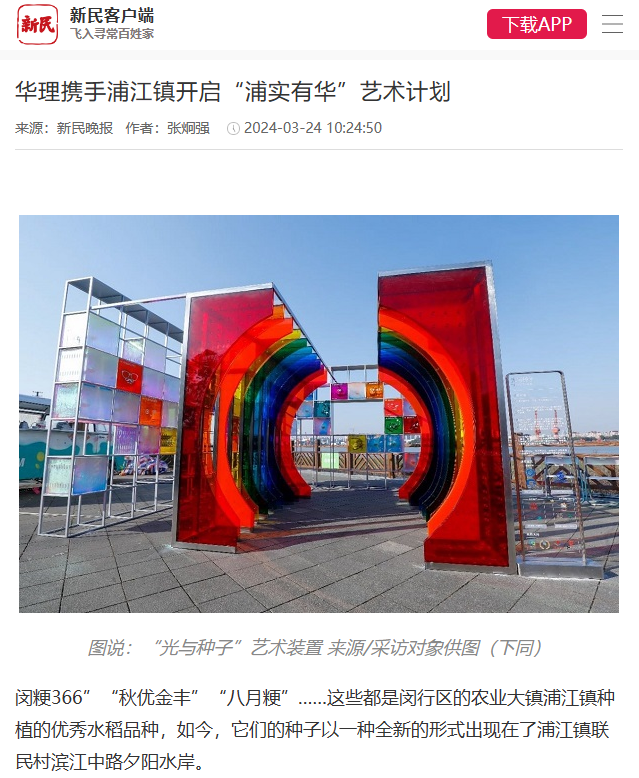 3月21日,“高校助力乡村振兴合作暨华东理工大学——浦江镇产学研基地合作签约仪式”在浦江镇举行。“浦实有华”艺术计划的第一个大型装置:“光与种子”正式亮相,10种农作物的种子被融入其中,将闵行和浦江的故事娓娓道来。