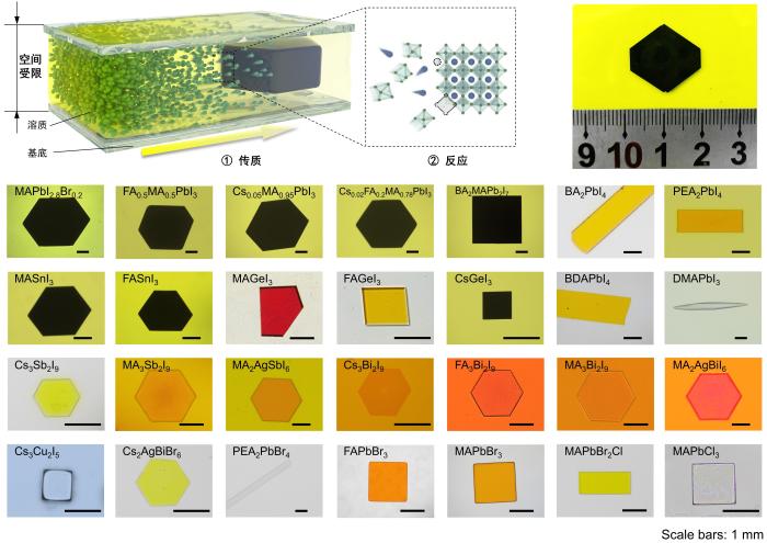相对多晶薄膜,钙钛矿单晶晶片具有极低的缺陷密度(约为多晶薄膜的十万分之一),同时兼具优异的光吸收、输运能力以及稳定性,是高性能光电子器件的理想候选材料。然而,国际上尚未有钙钛矿单晶晶片的通用制备方法,传统的空间限域方法仅能以高温、生长速率慢的方式制备几种毫米级单晶,极大地限制了单晶晶片的实际应用。