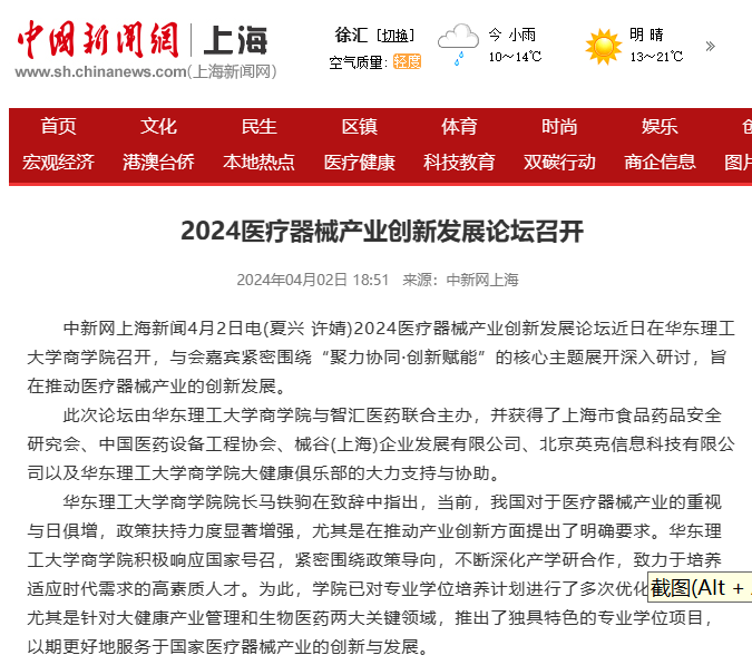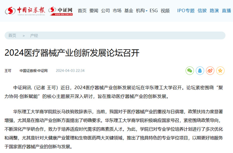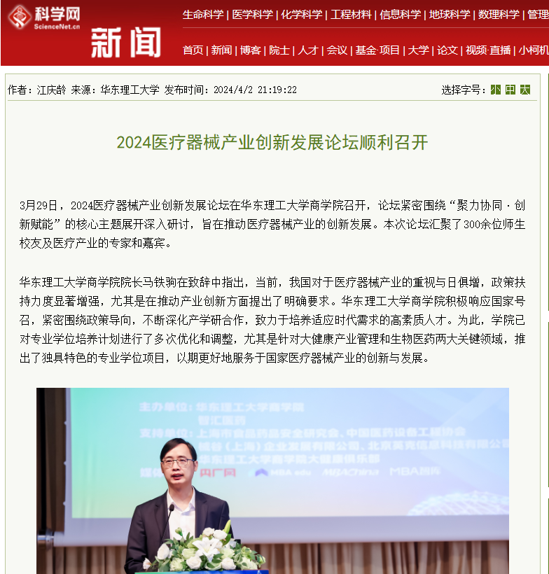 3月29日,2024医疗器械产业创新发展论坛在华东理工大学商学院召开,论坛紧密围绕“聚力协同·创新赋能”的核心主题展开深入研讨,旨在推动医疗器械产业的创新发展。本次论坛汇聚了300余位师生校友及医疗产业的专家和嘉宾。央视新闻客户端、中国证券报、中国新闻网、科学网、东方网、劳动观察、新民周刊、上海教育新闻网、第一教育、上海科技报、话匣子、上海教育电视台等10余家媒体进行了原发报道。本篇选取了部分报道予以转载。
