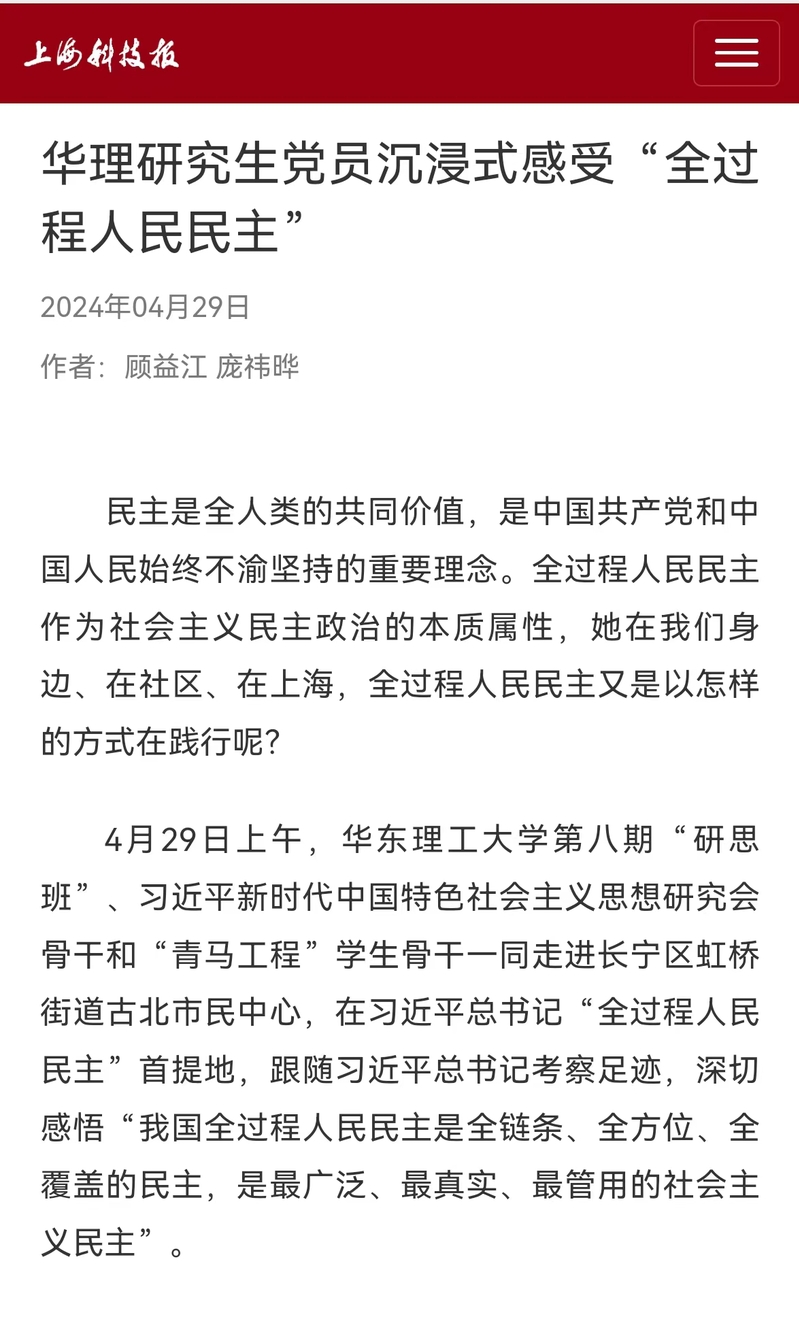【上海科技报】华理研究生党员沉浸式感受“全过程人民民主”