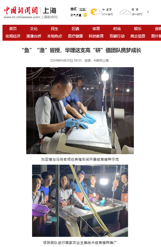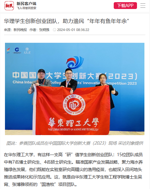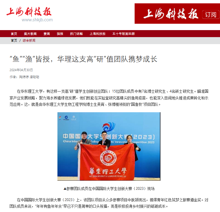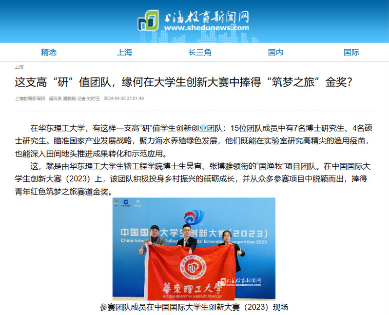 在华东理工大学,有一支高“研”值学生创新创业团队,他们瞄准国家产业发展战略,聚力海水养殖绿色发展,既能在实验室研究高精尖的渔用疫苗,也能深入田间地头推进成果转化和示范应用。这就是由生物工程学院博士生吴宵、张博雅领衔的“国渔牧”项目团队。在最近揭晓的中国国际大学生创新大赛(2023)上,该团队项目捧得青年红色筑梦之旅赛道金奖。《青年报》、中国新闻网、新民客户端、青春上海、上海教育新闻网、上海科技报、第一教育、话匣子、广州日报新花城等多家媒体进行了原发报道。本篇选取了部分报道予以转载。
