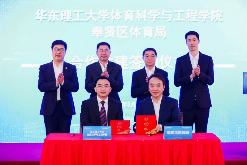 奉贤区体育局党组成员、副局长杨洁兵,三级调研员冯卫标,体育科学与工程学院党委副书记吴婷,副院长韩骏,各系所中心负责人及教师代表参加了签约仪式。
