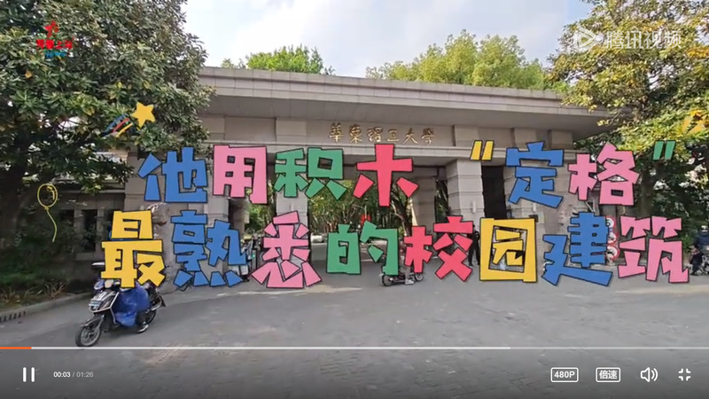 特别是图书馆,不仅是因为图书馆的外观特征与积木的契合度高,还因为他在了解华理的校史校情时,记得图书馆的外观设计借鉴了“烽火台”的外形,目的是体现华理人严谨求实、居安思危的精神。