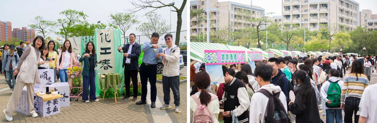 据介绍,市集持续开展两天,共设有18个摊位,分为春华探秘园(体验区)、春韵匠心坊(手作区)、春味食光集(美食区)3个区域。当天下午,随着“开市锣”的敲响,风檐广场瞬间热闹起来,各个摊位前聚集了一大批同学。在“清远茶香”品茶、在“摇风阁”制作漆扇、在“百草春”制作香囊、在“博格棋铺”对弈,更有色香味俱全的“花栗食社”现制糕点、“曦酒家”现调美酒……琳琅满目的摊位和舞台表演让人目不暇接,现场气氛十分热烈。