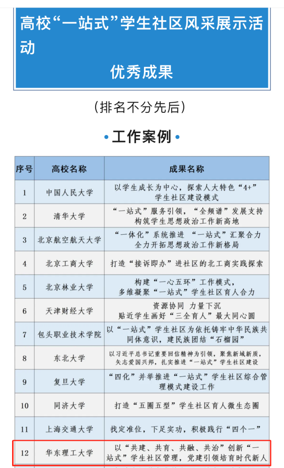 目前,高校“一站式”学生社区综合管理模式正进入高质量发展的阶段。今年3月,为进一步推动“一站式”学生社区创新发展,学校坚持以党建为引领,充分发挥党支部战斗堡垒作用,面向全体本科生党支部开展“一站式”学生社区党支部示范项目创建工作,经过评选,最终十大优秀项目入选重点培育名单。未来将聚焦红色社区、书香社区、悦动社区、致知社区、聆心社区、“职”引社区等6个方面,努力打造具有特色品牌、示范引领和辐射带动影响作用的示范项目,不断探索具有华理特色、体现思政要求、贴近学生实际的学生社区育人新格局。