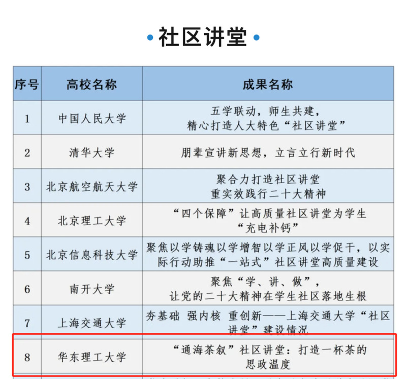2016年“通海茶叙”系列活动首次推出。随着2019年“一站式”学生社区综合管理模式建设的推进,学校以“通海茶叙”三周年庆典为契机,将“通海茶叙”活动下沉至学生社区,将社区空间资源和思政品牌活动进行有机融合,并提出每学期举办100场社区讲堂的目标。迄今,“通海茶叙”共计开展963场主题活动,内容涉及科研、创业、养生、法律、体育、理想信念、家国情怀、传统文化、金融理财、心理健康、生涯规划、榜样力量等各种方面,使16000余人次的学生参与者直接受益。活动以“师生相约一小时,通海湖畔叙真知”为理念,通过小规模的“谈式教育”实现因材施教、因人制宜的个体化培养,打造多主题、高频次、强互动、休闲式的系列社区讲堂,传递一杯茶的思政“温度”。相关工作入选中组部《基层党组织书记案例选编(高校版)》,出版著作《通海茗语——华东理工大学“谈式”育人模式实践》,也得到了新华社、光明日报、中国青年报、解放日报等10余家媒体的报道。