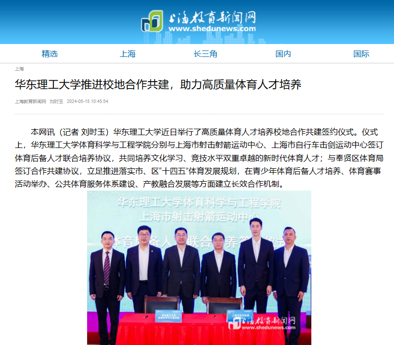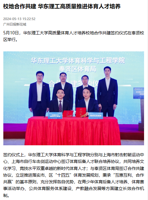 5月10日,华东理工大学高质量体育人才培养校地合作共建签约仪式在奉贤校区举行,体育学院分别与上海市射击射箭运动中心、上海市自行车击剑运动中心签订体育后备人才联合培养协议,与奉贤区体育局签订合作共建协议。中国新闻网、中国发展网、文汇APP、东方网、第一教育、上海教育新闻网、广州日报新花城等媒体对此进行了相关报道。