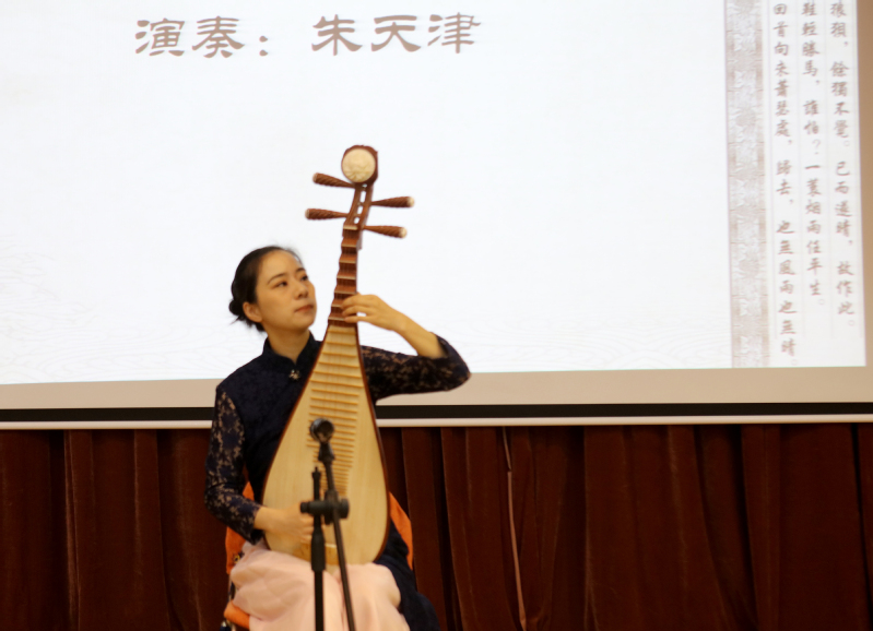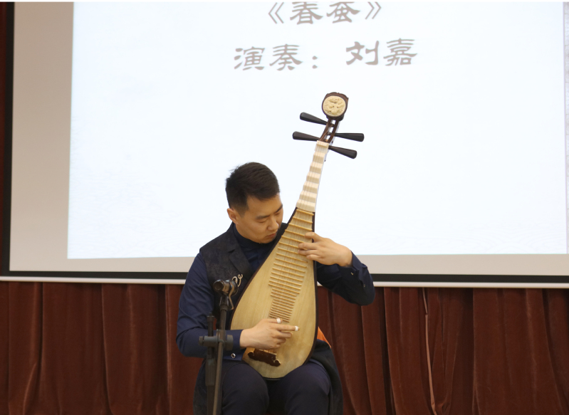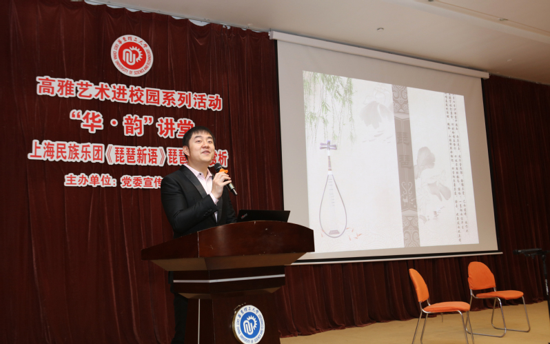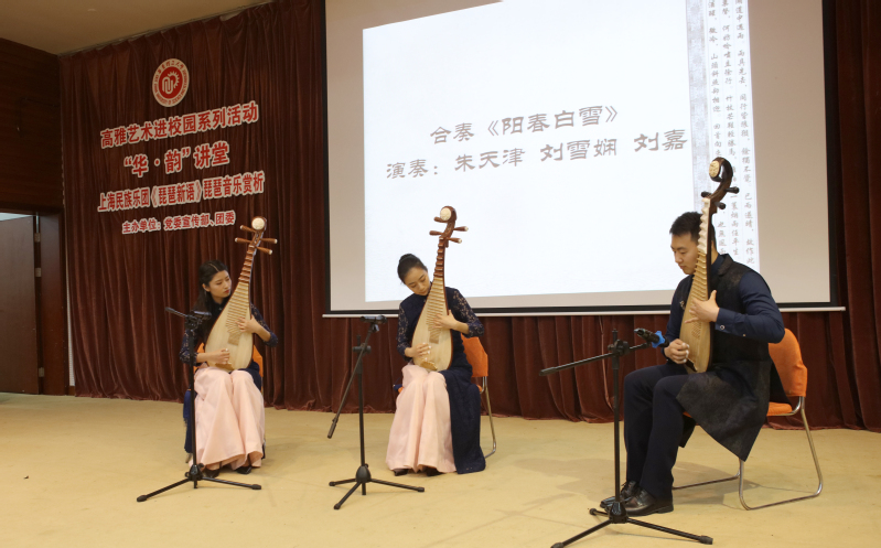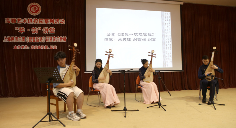 5月21日下午,“华·韵”讲堂——上海民族乐团《琵琶新语》琵琶音乐赏析在奉贤校区敬贤堂举行。本次活动作为高雅艺术进校园系列活动之一,由党委宣传部、团委联合主办,邀请上海民族乐团朱天津、刘雪娴、刘嘉三位优秀青年琵琶演奏家,带来多首琵琶传统古曲及当代作品,上海民族乐团主持人朱齐麒结合演奏曲目详细介绍了琵琶的起源和历史发展脉络,带领师生在古今交织的旋律中,欣赏琵琶亦文亦武、历久弥新的艺术魅力。