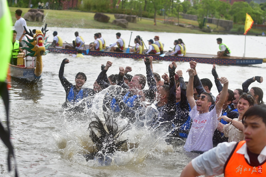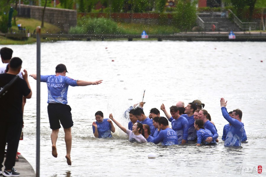 “ECNU!ECNU!ECNU!”5月25日下午,杭州湾边,通海湖畔,迎端午、赛龙舟——华东师范大学留学生龙舟队夺冠后难掩兴奋之情,“扑通扑通”纷纷跳入河道,接受岸上中外观众对他们校名缩写的阵阵欢呼。与去年一样,蝉联冠军的男女混合团队享受了“特权”——全体跳船、入水庆功……