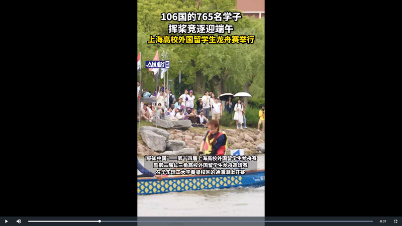 5月25日,“感知中国”——第十四届上海高校外国留学生龙舟赛暨第二届长三角高校外国留学生龙舟邀请赛在华东理工大学奉贤校区的通海湖上开赛。34支队伍的765名参赛选手来自106个国家,他们在湖上挥桨竞逐,吸引数千名观众呐喊加油。经过激烈的角逐,最终华东师范大学留学生龙舟队拔得头筹,亚季军分别由上海海事大学和南京理工大学获得。 据悉,上海高校外国留学生龙舟赛自2008年开始落户华理,为增进国际友谊、促进文明交流互鉴搭建了很好的交流平台。该赛事的规模不断扩大,去年首次扩展至江浙皖等长三角地区。今年参赛队伍规模继续扩大,作为“感知中国”系列活动之一,赛事的辐射力和影响力进一步增强。(东方网·纵相视频 范易成 蔡黄浩)