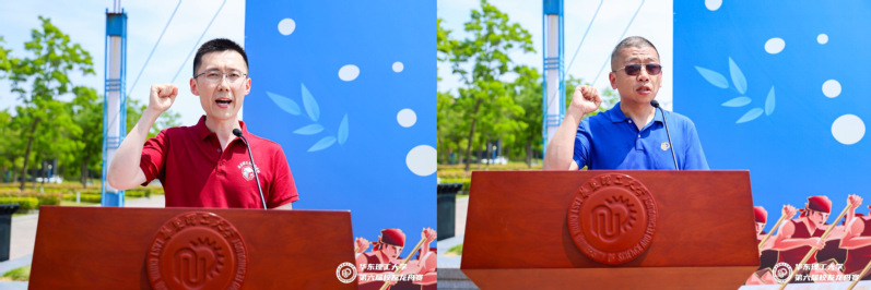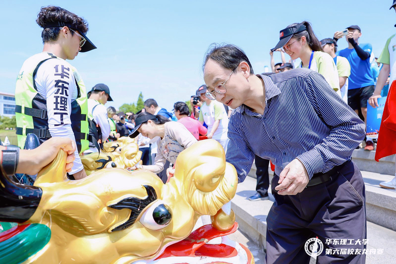 随后,华东理工大学校友总会秘书长李建伟、化工学院党委书记朱学栋、化学与分子工程学院党委书记张文清、材料科学与工程学院党委书记袁媛、法学院党委书记丁灏、体育科学与工程学院党委书记徐文方、王芝眉,以及上海相宜本草化妆品股份有限公司首席政府事务官、上海相宜公益基金会秘书长崔莉共同为龙舟点睛。体育科学与工程学院副院长韩骏主持比赛,运动员代表张彬、裁判员代表孙健分别宣誓。