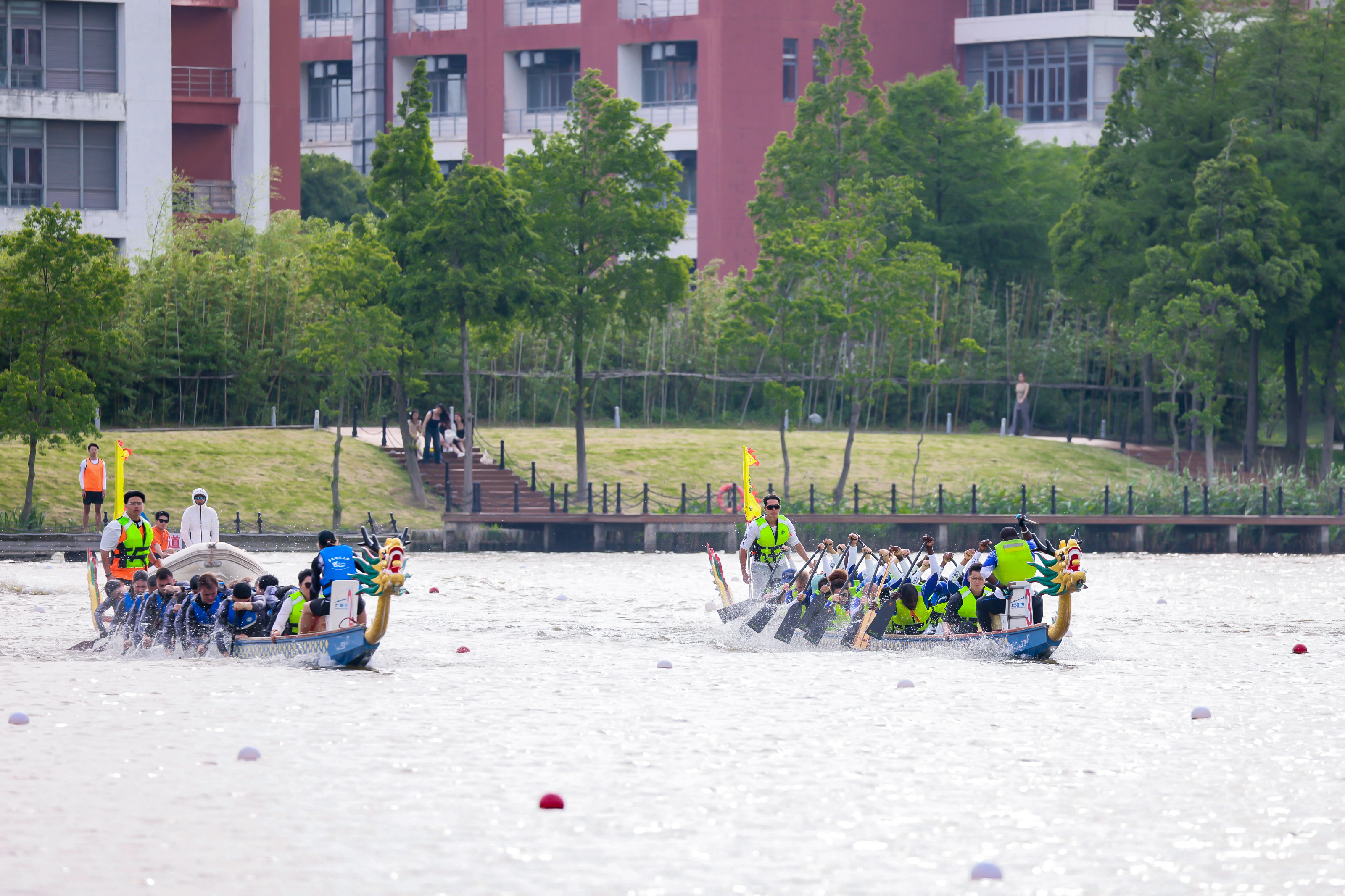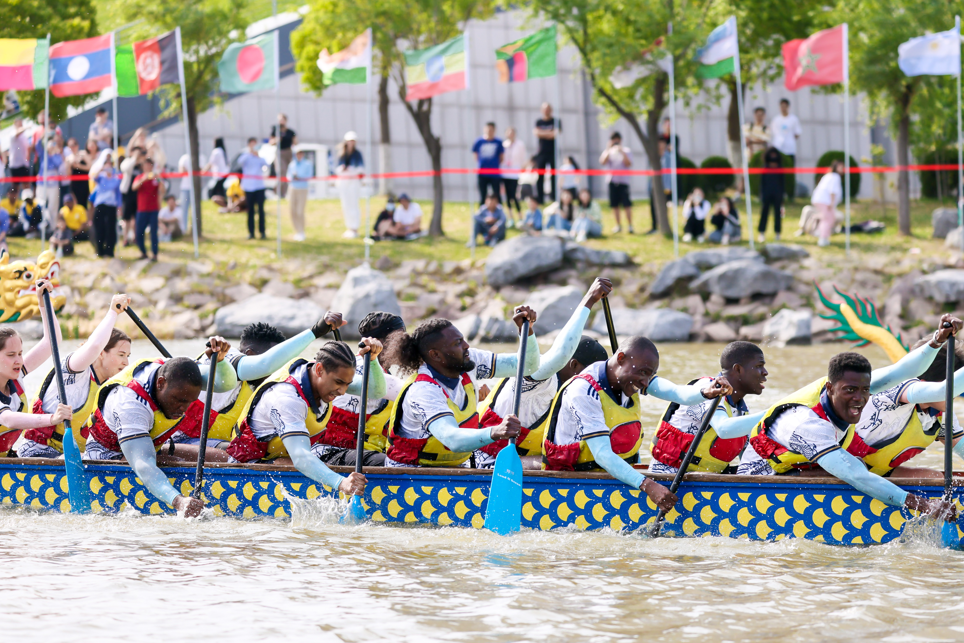 “喧江雷鼓鳞甲动,三十六龙衔浪飞。”5月25日,华东理工大学奉贤校区通海湖上热闹非凡。2024年“感知中国”——第十四届上海高校外国留学生龙舟赛暨第二届长三角高校外国留学生龙舟邀请赛隆重开赛。34支队伍、106个国家、765名参赛选手,来自复旦大学、南京理工大学、浙江大学、中国科学技术大学等江浙沪皖地区的留学生龙舟队挥桨竞逐,吸引了数千名观众汇集在通海湖畔一睹盛况。