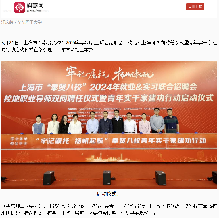 5月21日,上海市“奉贤八校”2024年实习就业联合招聘会、校地职业导师双向聘任仪式暨青年实干家建功行动启动仪式在华东理工大学奉贤校区举办。本次活动充分联动了教育、共青团、人社等各部门、各区域资源,以发挥在奉高校组团优势,持续挖掘高校毕业生就业渠道,多渠道帮助毕业生尽早实现就业。中国教育报客户端、中国新闻网、科学网APP、《劳动报》、文汇APP、第一教育、上海科技报、上海奉贤以及上海电视台等近10家媒体进行了原发报道。