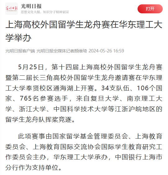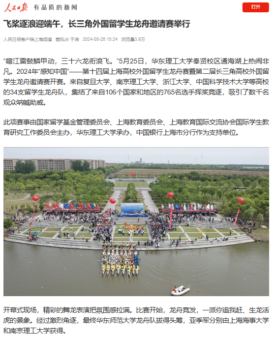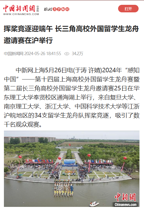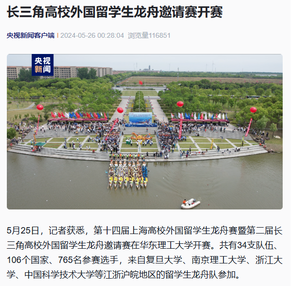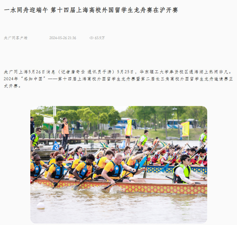 5月25日,来自长三角地区的留学生挥桨竞逐,34支队伍、106个国家、765名参赛选手参加2024年“感知中国”——第十四届上海高校外国留学生龙舟赛暨第二届长三角高校外国留学生龙舟邀请赛。央视新闻客户端、人民日报客户端、光明日报客户端、央广网、中国新闻网、上观新闻、文汇APP、澎湃新闻、上海电视台、科学网、Shanghai Daily、新民APP、《青年报》视频号、021视频、东方网、东方财经·浦东、第一教育、上海科技报、上海教育新闻网、广州日报新花城、劳动观察、话匣子、新民周刊、上海热线等20余家媒体进行了原发报道。本篇选取了部分报道予以转载。