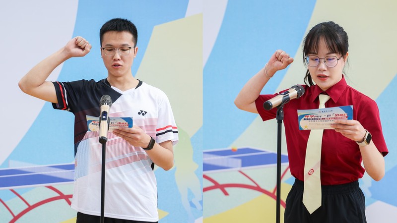 来自上海市乒乓球协会的国家级裁判徐若琳代表教练员宣誓,来自信息科学与工程学院控制工程专业2023级硕士研究生菅连浩代表运动员宣誓。