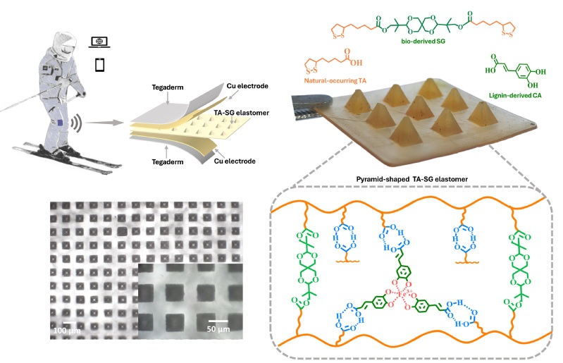 近期,该研究团队报道了一种具有本征自愈能力和闭环回收性的新型介电层弹性体。该弹性体源于生物基螺二醇衍生二硫动态共价适应性网络(CANs),并辅以木质素合成中间体咖啡酸及金属铁离子为掺杂交联剂,所构筑的可回收动态聚合网络因合理的刚性螺二醇/柔性二硫组分比而具备了良好的机械柔韧性和热稳定性,也因其丰富的氢键和金属-儿茶酚配位键而使其具备常温自修复能力。所组装的电容压力传感器灵敏度高达9.26 kPa-1,响应时间与恢复时间分别为32ms和24ms。该传感器适用于实时人体运动监测,且在损伤自愈合或闭环回收后,依旧持续输出稳定的检测信号。这将有助于推动电容传感器研究向动态智能、高性能和可持续的方向发展。