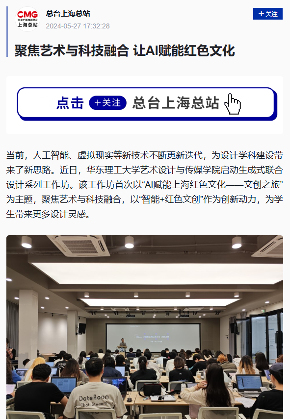 5月25日,华东理工大学艺术设计与传媒学院启动生成式联合设计系列工作坊,首次工作坊以“AI赋能上海红色文化——文创之旅”为主题,聚焦艺术与科技融合,以“智能+红色文创”作为创新动力。