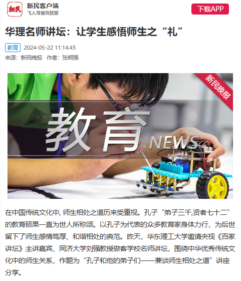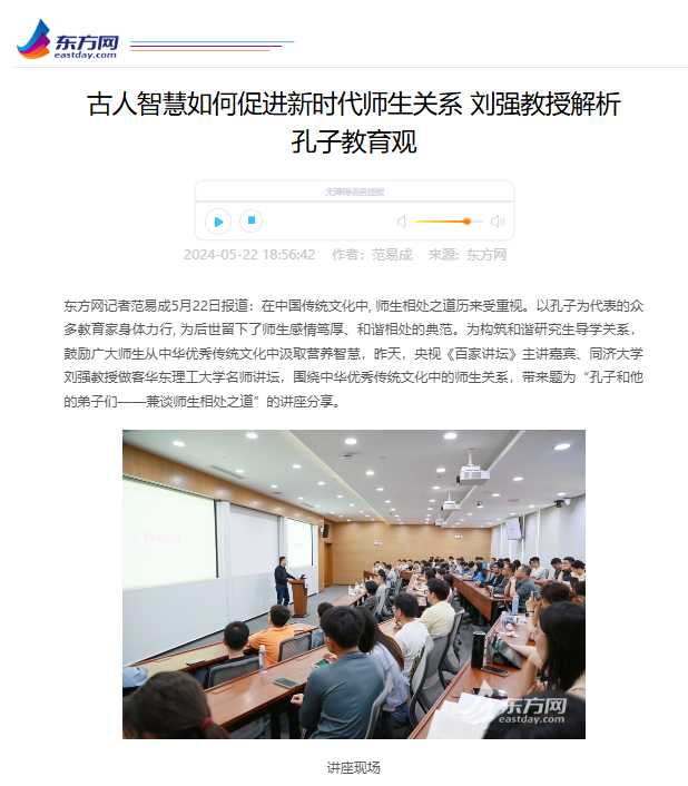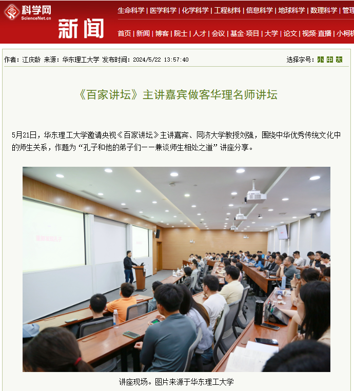 5月21日,华东理工大学邀请央视《百家讲坛》主讲嘉宾、同济大学刘强教授做客学校名师讲坛,作题为“孔子和他的弟子们——兼谈师生相处之道”讲座分享,引导师生从孔子及其弟子中感悟师生之“礼”。 中国新闻网、科学网、新民APP、东方网、第一教育、上海科技报、上海教育新闻网、广州日报新花城、劳动观察、话匣子等10家媒体进行了原发报道。本篇选取了部分报道予以转载。
