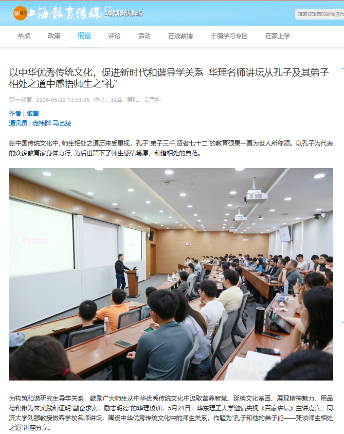 【第一教育】以中华优秀传统文化,促进新时代和谐导学关系 华理名师讲坛从孔子及其弟子相处之道中感悟师生之“礼”