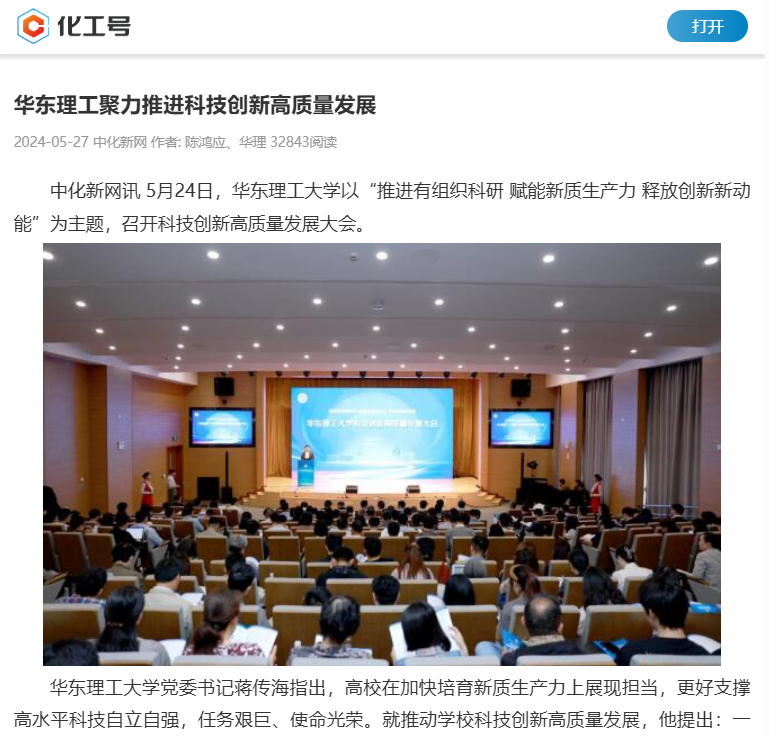 中化新网讯 5月24日,华东理工大学以“推进有组织科研 赋能新质生产力 释放创新新动能”为主题,召开科技创新高质量发展大会。