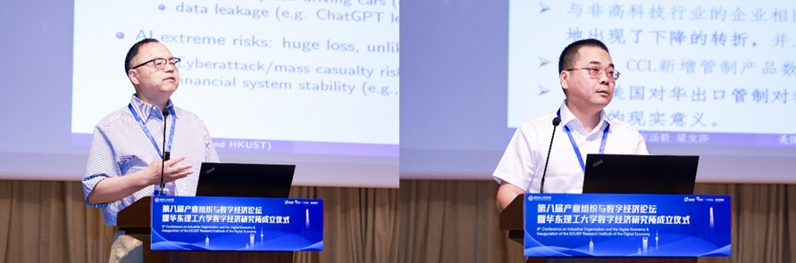 在大会主旨演讲环节,陈勇民教授主要讨论了人工智能(AI)在产品自动化和创新中的应用,以及如何提高人工智能产品的安全性。他提到,人工智能正在替代人工操作,如自动驾驶汽车,但也需关注其潜在风险。他在演讲中区分了针对人工智能普通风险的研发和针对极端风险的研发,讨论了通过法律责任和规制对研发进行有效激励的重要性。潘士远教授探讨了在面对美国出口管制时,中国企业如何进行创新活动。他的研究发现,美国对华出口管制会通过阻碍跨国知识流动抑制企业创新质量,并通过企业供应链网络产生网络溢出效应。他指出,上游供应商的管制风险会抑制下游企业拓展新领域,但同时会刺激下游企业提升专利质量。