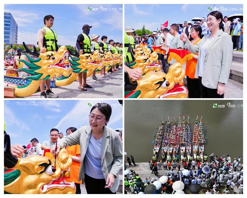 随后,郑庆寰、陆腾、殷若辉、贵州茅台酱香酒营销有限公司上海省区经理张健与商学院工会主席孙定东、国际交流与认证办公室主任彭泽余、资产与后勤管理办公室主任王庆飞、校友与发展中心主任袁竹君共同为参赛龙舟点睛,寓意和谐幸福、国泰民安。郑庆寰宣布正式开赛。