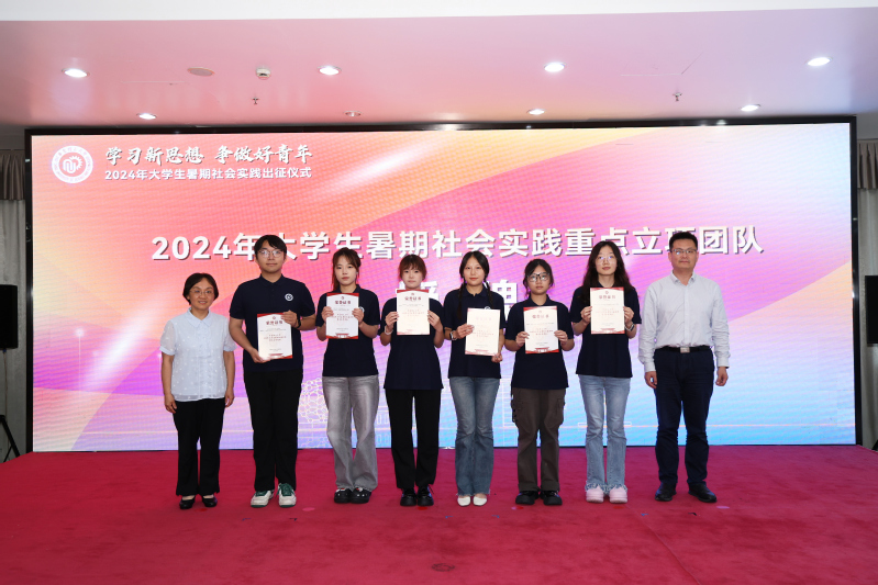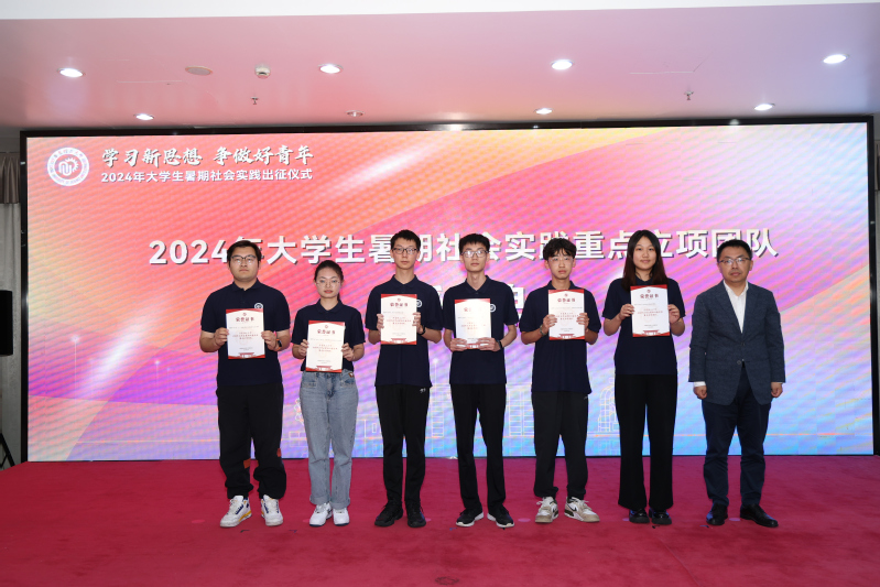 校党委研究生工作部部长孙洪锋、校党委学生工作部副部长陈庆升、教务处副处长万永菁为2024年大学生暑期社会实践重点立项团队授牌。