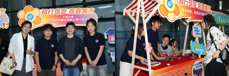 出征仪式后,“知行筑梦”青春市集——华东理工大学社会实践重点项目展演活动在通海厅外举行,吸引了众多同学前往观摩学习交流。