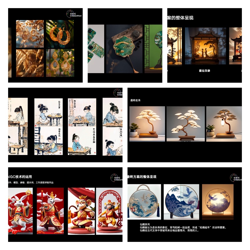 在经过前一天的线上学习后,50余位来自不同院校的学生对LLM在设计创意领域的应用、AI图像生成原理及策略已有所了解。在此基础上,同学们分组展开了江南文化文创设计创作实践,并进行了汇报展示。