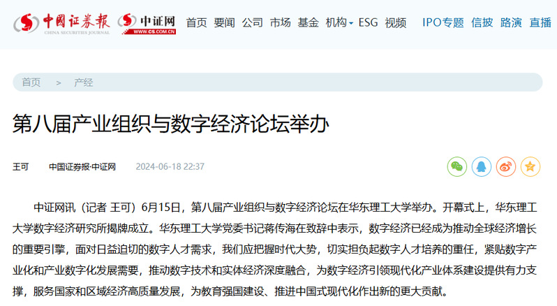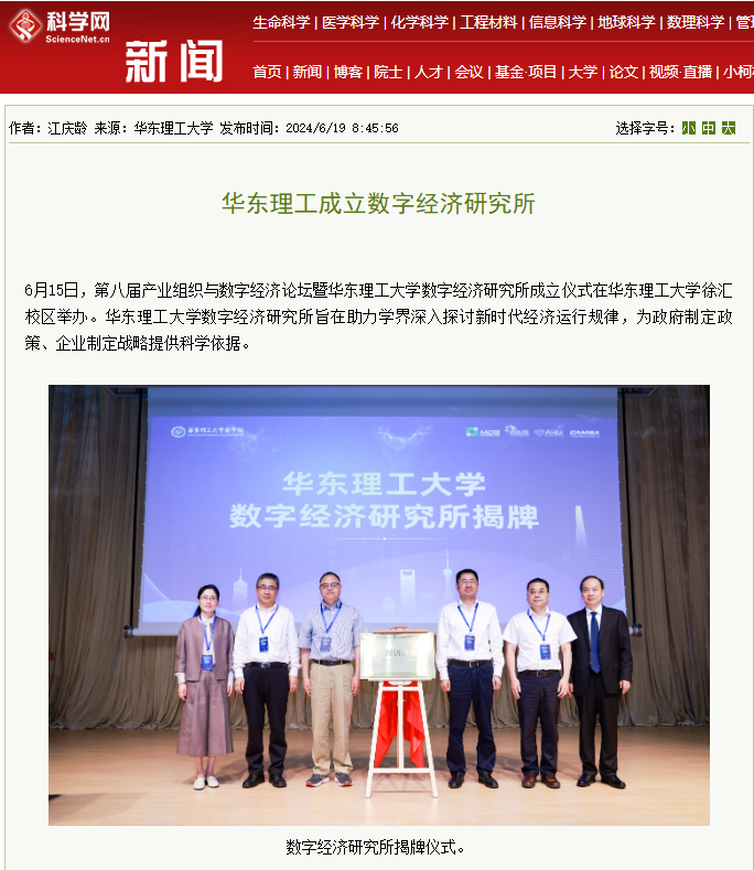 6月15日,第八届产业组织与数字经济论坛暨华东理工大学数字经济研究所成立仪式在华东理工大学徐汇校区举办。华东理工大学数字经济研究所旨在助力学界深入探讨新时代经济运行规律,为政府制定政策、企业制定战略提供科学依据。 光明日报客户端、中证网、科学网、中国新闻网、新民客户端、劳动观察、上海热线、第一教育、上海科技报、话匣子、广州日报新花城等10余家媒体进行了相关报道。