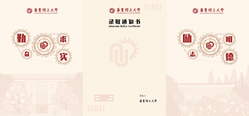 通知书背面绘制华理老图书馆插画及“勤奋求实,励志明德”的校训,寄语同学们上下求索、开拓进取、敢为人先。