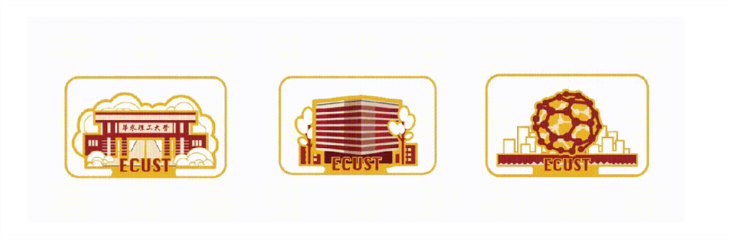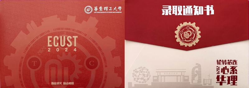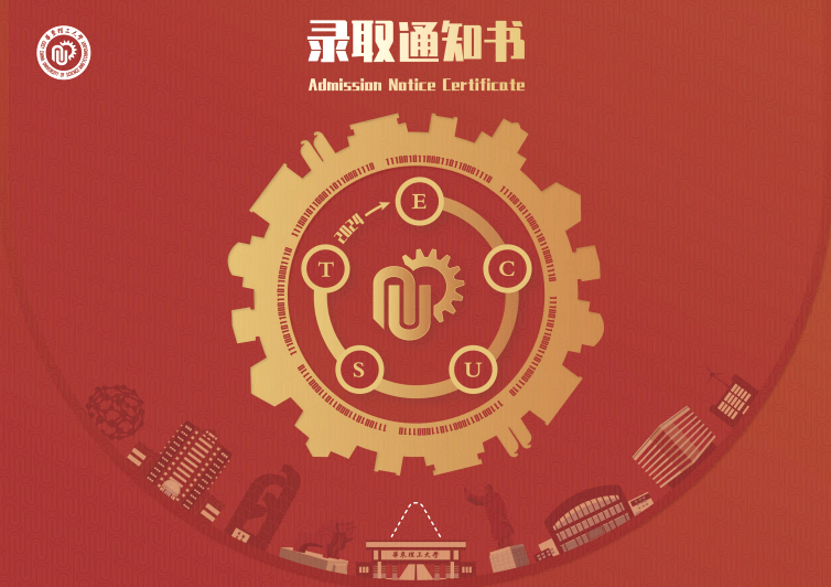 通知书的封面设计引用华理特色的齿轮元素,外形融入华理特色建筑,内圈采用“华东理工大学”二进制编码,环绕着华理英文缩写及校徽。随着时间齿轮的转动,同学们将在2024年与华理相遇。该元素作为关键线索,贯穿通知书整体。