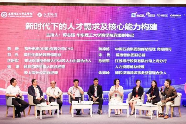 商学院党委副书记蒋志强主持了“新时代下的人才需求及核心能力构建”的分论坛。江苏银行股份有限公司上海分行、蒂升电梯(中国)有限公司、智联招聘、普华永道等不同行业的高层管理者和人力资源专家,围绕数字化、智能化趋势下企业所需人才核心能力的转变,实践经验在构建和提升个人核心能力中扮演的角色,产教融合在人才培养中的作用,以及商学院、企业与政府如何协同推进产教融合等焦点议题进行了交流。