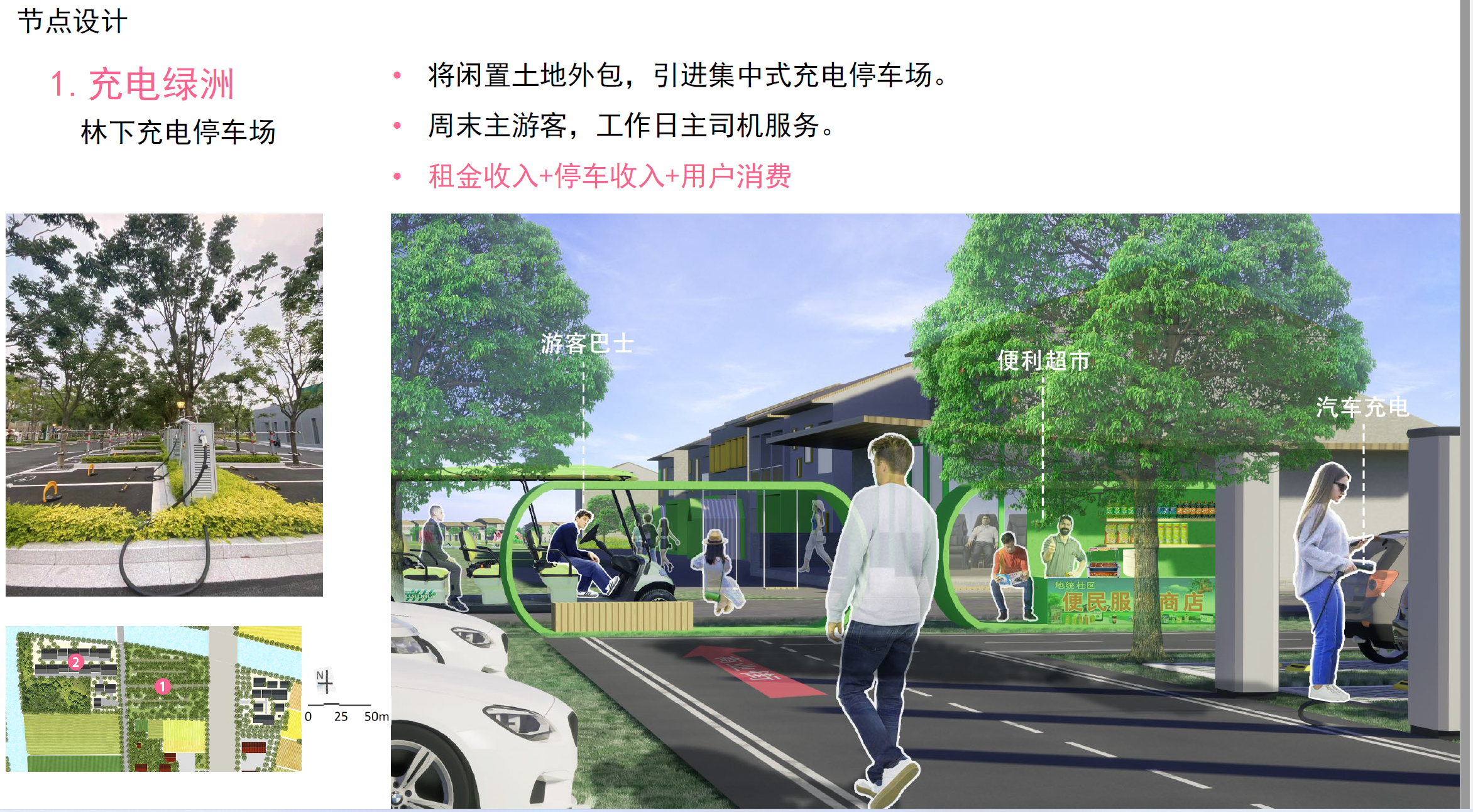 其中,“人生充电站”小组的规划将建东村作为承载“能量”的“充电站”,对内输入生态、产业、政策,通过风貌提升、产业升级等手段进行能量转化,再将能量对外输出,从而吸引外部游客,促进乡村经济高质量发展。在具体设计上,各种公共服务设施都采用了充电口的形态设计,原设计地房屋以改建为主新建为辅,未来将应用于等商业服务设施。
