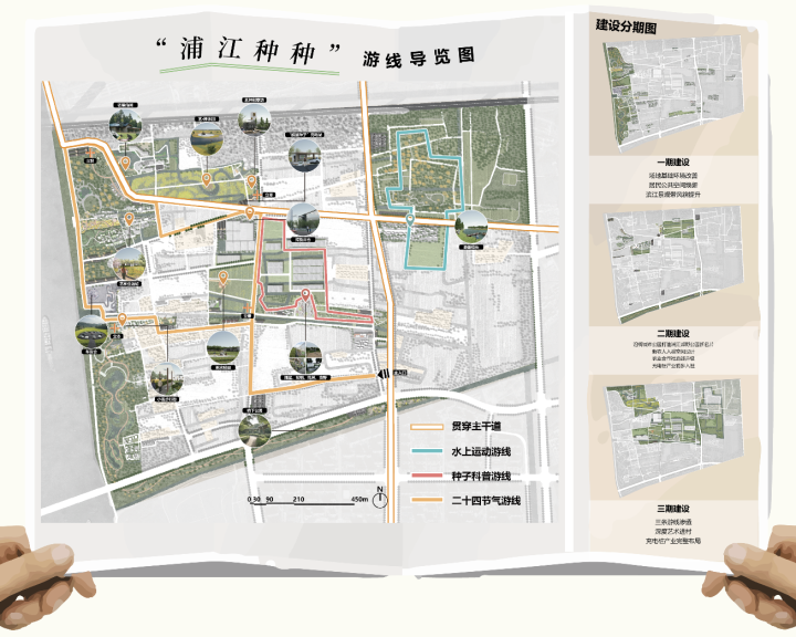 而“浦江种种”小组的规划方案以根植于乡土的“种子”为切入点,单字“种”呼应种子,“种种”又是浦江镇现状资源和浦江人民共同书写故事的总和,导出“浦江种种”的主题。具体方案规划中,提出三大发展方向:艺术进村、产业孵化和幸福萌芽,旨在打造“艺、教、居、游”四位一体新乡村,实现城市、乡村、自然的无缝衔接。空间规划为一岸,两轴、四环景观格局。为提升居民福祉,该组提出三大策略:产业升级拉动经济、用“渗透”替代“置换”,以及根据不同人群需求制定建设时间顺序,且优先考虑居民需求。